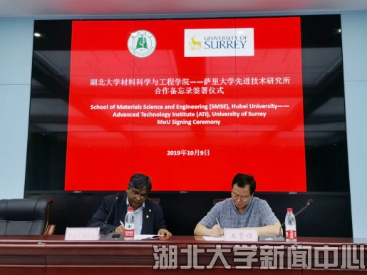 近日,湖北大学材料科学与工程学院和英国萨里大学先进技术研究所签署合作备忘录,在科研合作、教师互访、学生交换等方面达成一致协议,期望在“111基地”的基础上进一步推进实质性合作,为双方师生搭建更多、更大的合作平台。英国萨里大学先进技术研究所主任S. Ravi P. Silva教授、材料科学与工程学院负责人和师生代表参加签署仪式。