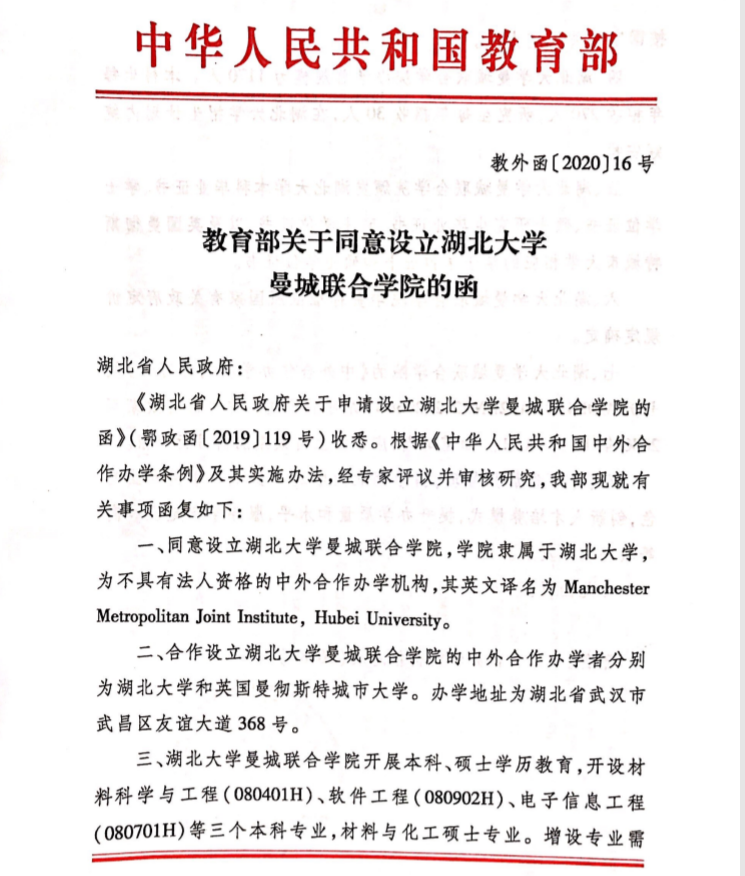 湖北大学与曼彻斯特城市大学的交流合作始于2015年,迄今已开展高层互访、教师交流、联合授课、合作研究、学生联合培养等多种形式的合作交流活动,具有深厚的合作基础。2015年12月,双方达成联合申办“湖北大学曼城联合学院”非独立法人中外合作办学机构的意向。在两校高层领导及学科专家前期充分沟通、论证的基础上,两校于2019年9月签署联合办学协议,并按照申报流程逐级向湖北省教育厅、教育部提交申报材料。2019年12月18日,根据教育部国际司的工作安排,两校高层领导联合代表团赴京参加了集中评议答辩。2020年4月26日,教育部正式发函批准设立“湖北大学曼城联合学院”。两校后续将进一步加强沟通,积极融合双方优质教育资源,主动创新人才培养模式,全力提高学科建设水平,努力打造国际化师资团队,使学院成为湖北大学国际化办学的标杆和示范。