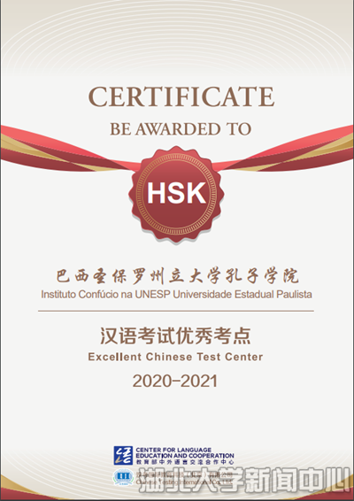 12月16日,由教育部中外语言交流合作中心与汉考国际教育科技(北京)有限公司(简称“汉考国际”)共同主办的“国际中文教育标准和考试”研讨会在线召开。大会对2020年度汉语考试优秀考点进行表彰,湖北大学与巴西圣保罗州立大学合作建设的孔子学院获此殊荣。