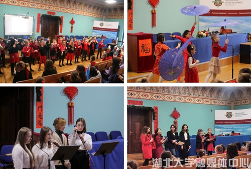 1月27日,湖北大学-波兰雅盖隆学院孔子课堂举办2023年中国新年庆祝活动,吸引超两百人参加,现场座无虚席。参加演出的学员既有幼儿也有成人,歌曲、舞蹈、小品、乐器等各式各样的表演好戏连台,为观众呈现一场视听盛宴,让人仿佛置身中国。
