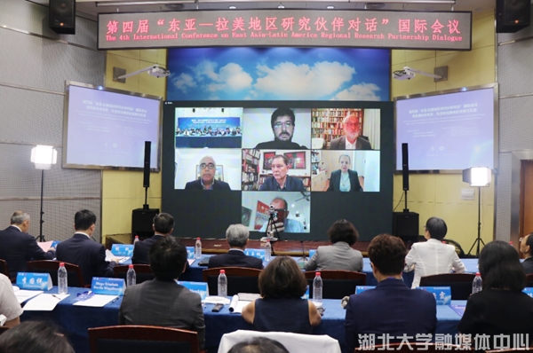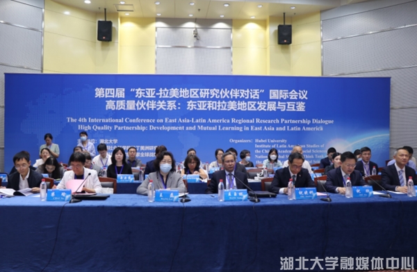 第四届“东亚-拉美地区研究伙伴对话”国际研讨会6月12日在湖北大学举行。此次会议以“高质量伙伴关系:东亚和拉美地区发展与互鉴”为主题,由湖北大学、中国社会科学院拉丁美洲研究所和中国社会科学院国家全球战略智库共同主办,来自中国、巴西、马来西亚、印度尼西亚、阿根廷、哥伦比亚、智利、韩国、古巴、越南、墨西哥、秘鲁、委内瑞拉、日本等国高校和研究机构的专家学者近百人通过线上线下方式参加会议。