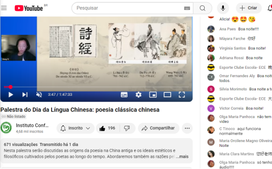 当地时间4月16日晚,湖北大学-巴西圣保罗州立大学孔子学院举行了一场线上专题讲座,庆祝即将到来的“国际中文日”。本次讲座主题为《言外之意——中国古典诗歌中的含蓄与美学》,由文学专业硕士毕业的孔院中文教师衡奕用葡萄牙语主讲,吸引了600余名中葡双语观众在线观看并积极参与讨论。