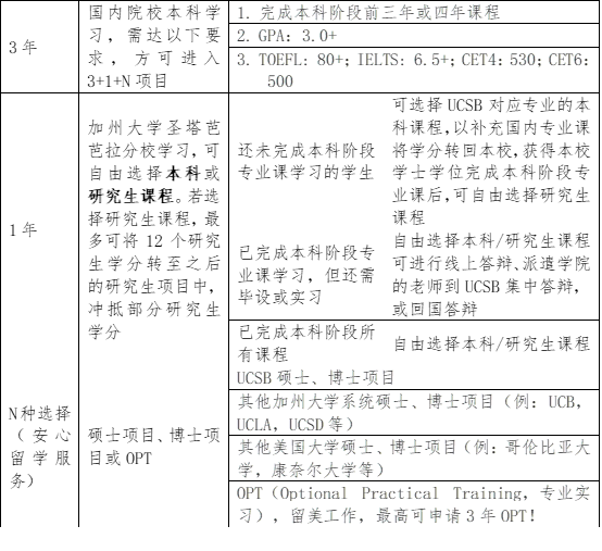 该项目将遵循以下联合培养模式:3年国内院校本科学习+1年加州大学圣塔芭芭拉分校学习+N种选择。